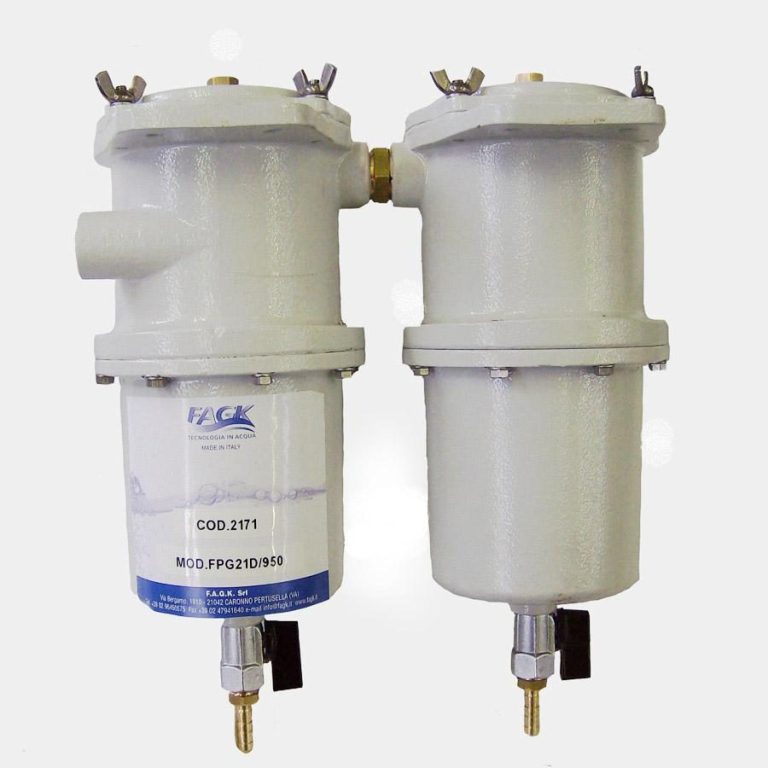 Prefiltro decantatore mod. FPG21/23 DOPPIO con elemento filtrante in carta da 10 micron e in acciaio da 100 micron.